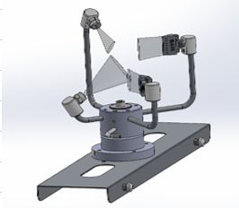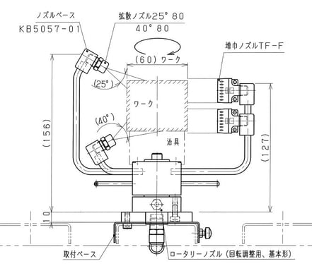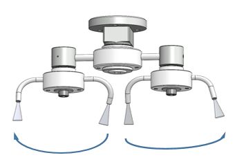2組のロータリーノズルが回転センターの両側に配置された構造で、エア噴射力でそれぞれが回転、中心に対して公転して、その範囲全体に下向き多方向からエアガン的直噴射をするため威力ある洗浄およびエアブローを行います。