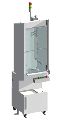 一般には作業者がワークの脱着を行いますが、ロボットで行う場合のために、洗浄・乾燥が完了後、シャッター”開”の信号でロボットが対応できるための端子台仕様です。